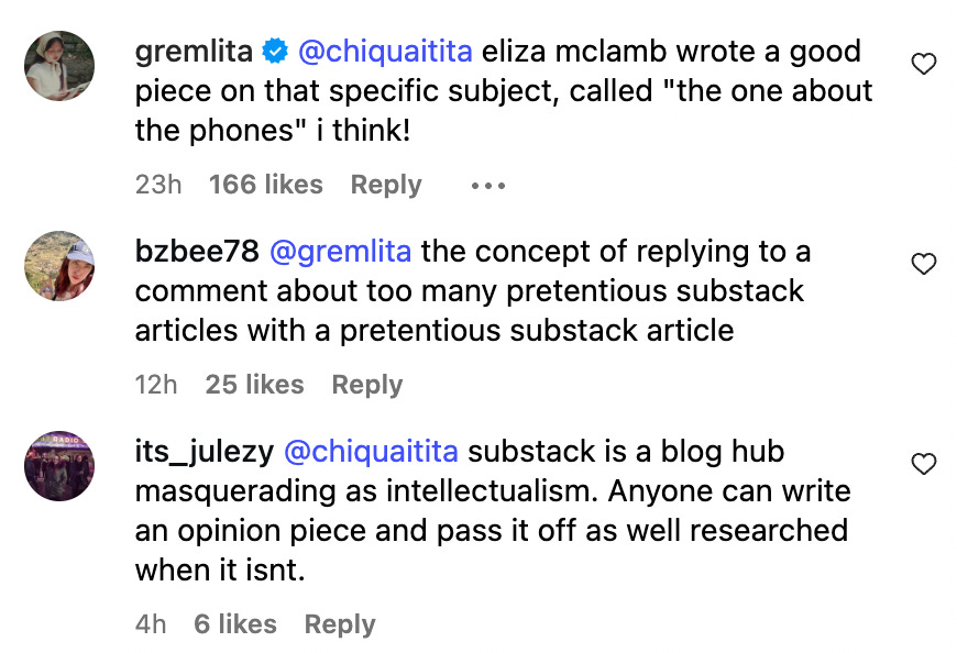 Whatever the case, I’m not reading too much on here anymore. I hesitate to say that Substack is in its flop era, because statistically, new people join every day. Charli XCX and Lizzo now have blogs here too. But I think for a small demographic of people who joined the platform in its early days for a very specific reason, it’s become fatiguing to stay. For some, this fatigue has spiraled into outright denigration of the platform as a whole.