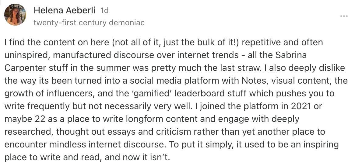 I somewhat agree, especially because I came to Substack for similar reasons to Helena. And over the past several months, I’ve noticed a gradual shift in my own Substack usage. I remember, even as late as earlier this year, I would have no issue finding new and interesting articles to read via my home feed. I would actually find too many and have to bookmark them for later! I now find myself avoiding that tab completely and going straight to my subscription box. Similar to Helena, my feed is mostly notes, or posts on the same 3-5 heated topics, or Pinterest-adjacent photo slides.