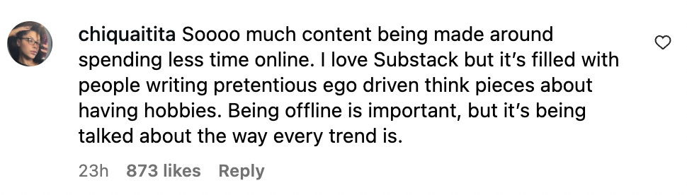I don’t know if people took her too seriously or what, but now it feels like “traffic-bait” has shifted from lists to hot take opinion pieces. While I’m sure the list structure still exists (I mean, I published one myself last September on movies), I personally see less of it. Maybe this is just my algorithm, but it also makes sense that this content can flood a home feed: anything that’s ‘controversial’ has more engagement traction, not only because opinionated people leave comments but because they tend to restack these essays too.1